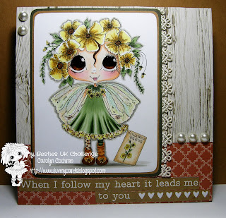 Well I have yet to figure out my problem with the inability to pick up the rich purples on my card by my camera-imagine that all the blues you are seeing are really purple! I put orange dots on her pants and then put Stickles on top of those. The image is triple matted with a black glitter cardstock and orange on the back layer. The card is wrapped with baker's twine with some embellishments of a felt pumpkin and black scary cat. I am lovin' the multi-colored chevron paper!On the inside liner, I had some great spooky house paper that was a recent purchase-so cool! I used a sentiment from KKS that was matted in orange and purple and this great button that has a black cat in it! I know several deserving friends that I could send this too--woooooooo will it be? This Challenge at My Besties UK lasts all month and we'd love to see your creations--Spooky or Fun we love it all and can't wait to see all of you there!